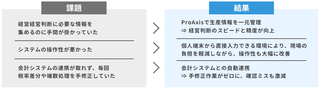 かつて地元のシステム会社に構築してもらったレガシーシステムでは対応できなかった、「原価の正確な把握」や「業務の見える化」を、ProAxisで実現できたことが有り難いです。