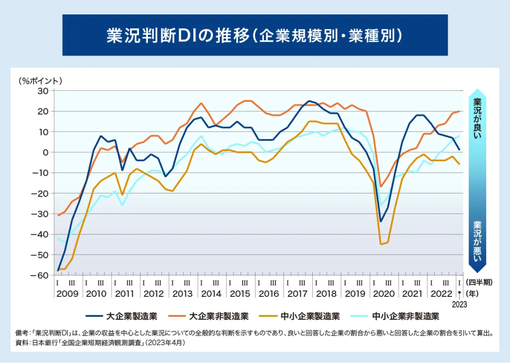 「中小企業製造業」の業況判断DIは、2022年第2四半期以降緩やかに改善していましたが、2023年第1四半期以降は悪化しています。