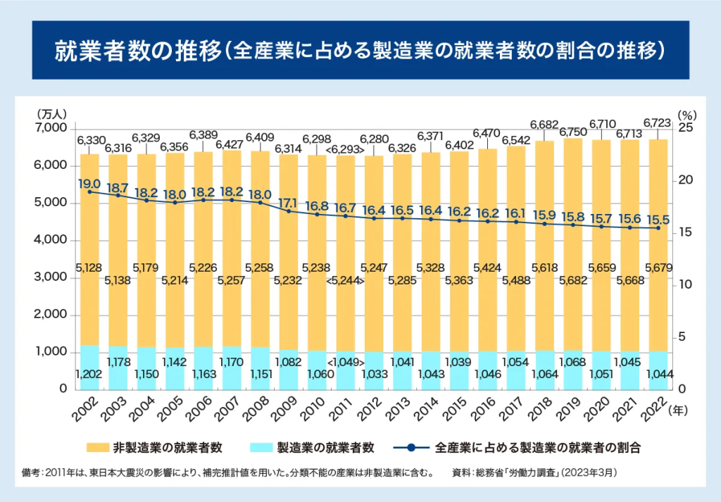経済産業省の「2023年版ものづくり白書」によると、製造業の就業者数は2022年時点で1,044万人と2002年時点よりも約160万人減少しました。全産業の就業者数が微増しているのに対して、製造業の就業者数は減少傾向にあることがうかがえます。