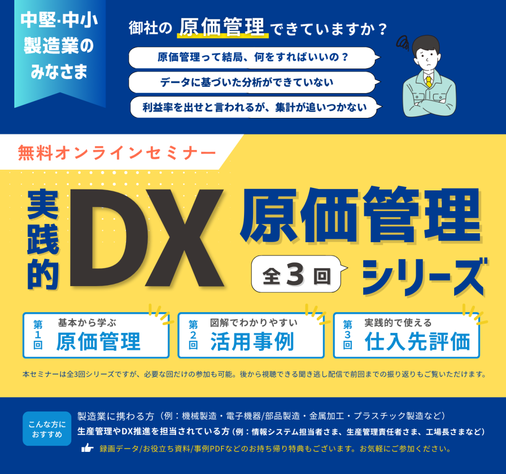 キッセイコムテック株式会社では「製造業のための原価管理」セミナーを開催します。 申し込みはこちら 詳細は以下のチラシをご覧ください。(※クリックでPDFが開きます) -