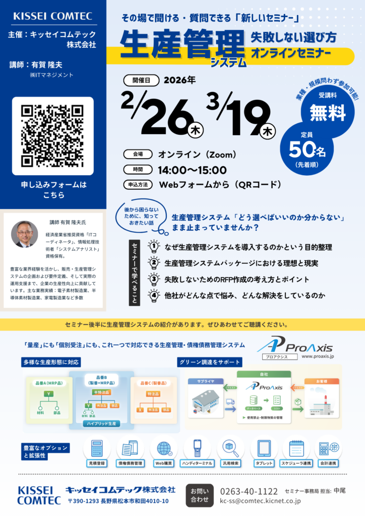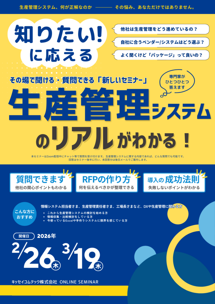 キッセイコムテック株式会社では「失敗しない!生産管理システムの選び方」セミナーを開催します。