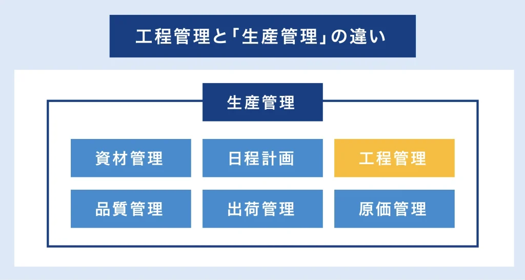 工程管理が納期に重点を置いて管理する業務であるのに対し、生産管理は生産業務全体を管理することを指します。つまり、工程管理は「生産管理の一部」だと言えます。