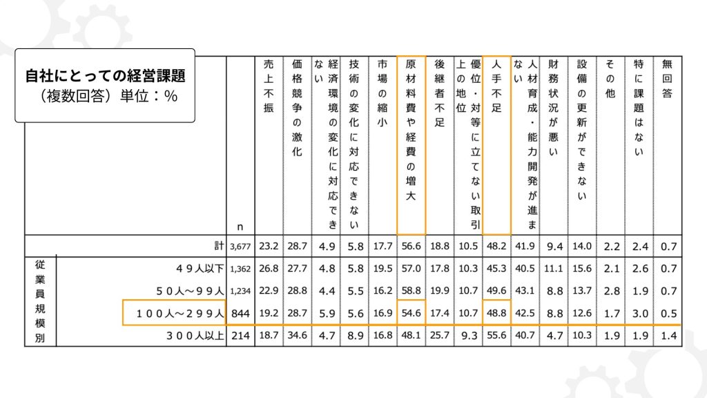 JILPTの2023年における上記の資料を見てもわかるとおり、54.6%もの中小企業が「原材料費や経費の増大」を課題として挙げています。