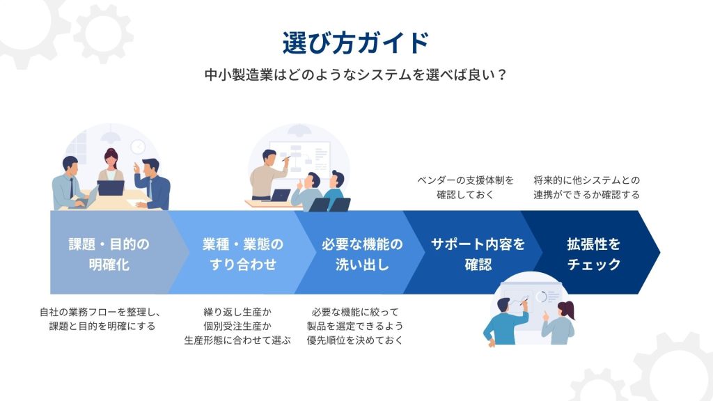 中堅・中小企業の製造業における業務改善に役立ち、将来的にも長く使える生産管理システムの選び方のポイントは、以下のとおりです。
