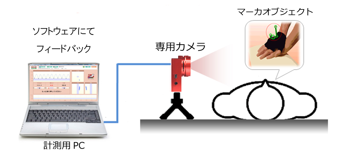 専用カメラで手の甲に取り付けたマーカの動きを計測し、正しい胸骨圧迫をリアルタイムに音声指導します。