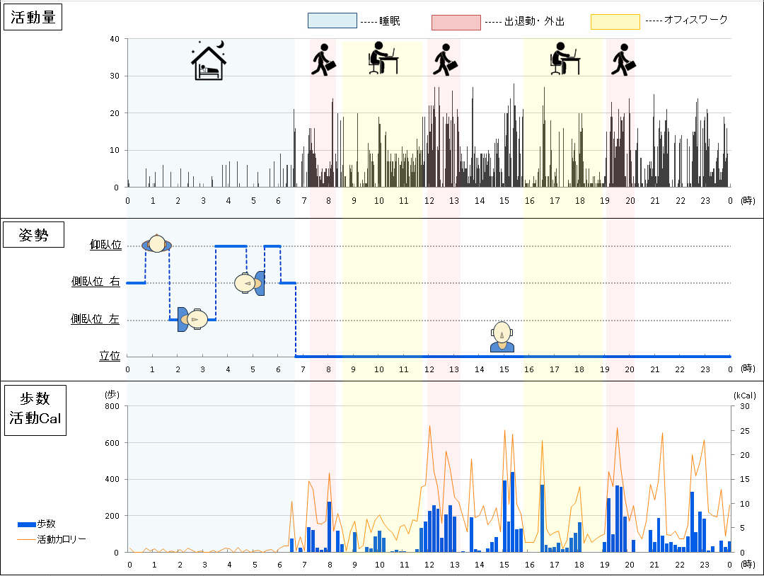 内蔵された3軸の加速度センサーによって、指定した時間間隔で日常生活における姿勢(立位、倒立位、側臥位(左/右)、仰臥位、伏臥位)を判定します。同時に活動量やカロリー・歩数も記録。