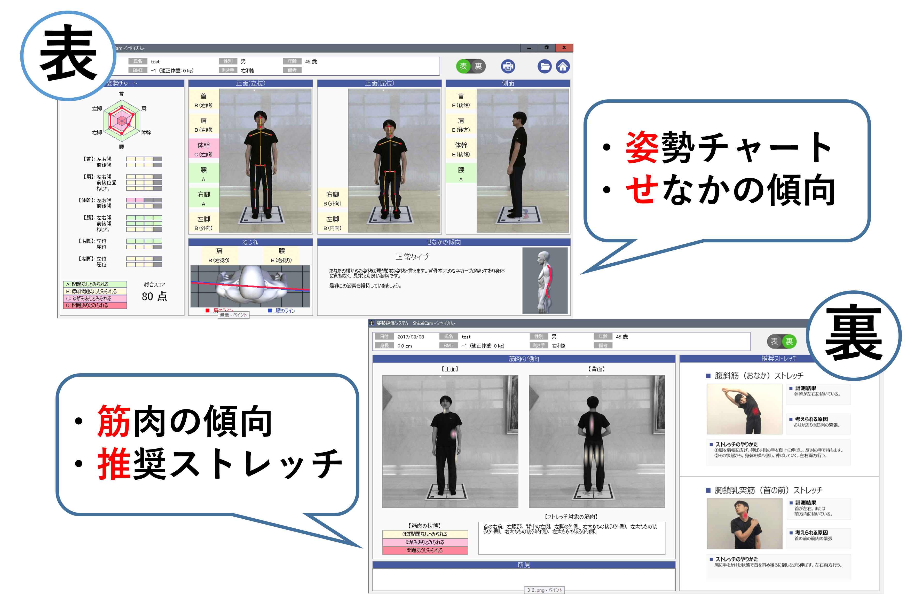 撮影後、すぐにシンプルで分かり易い結果レポートを出力。レポートには、お勧めのストレッチも掲載されます。