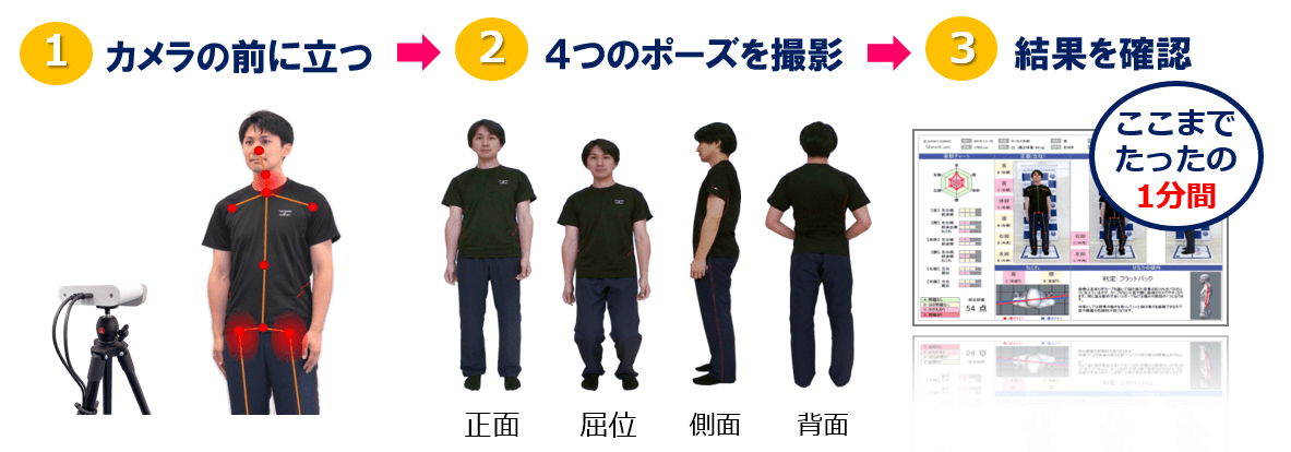 マットの上に立ってもらい、4ポーズ(正面、屈位、側面、反面)を撮影するだけ。ナビゲーション付きの画面で、誰でも簡単に操作できます。