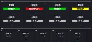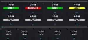 各設備の稼働状況を一覧で表示します。各設備の正常・異常を同時に確認することが可能になります。また、工場内の温湿度も同時に表示することができ、稼働状態との関係性を把握することで、生産性の改善に役立てることができます。