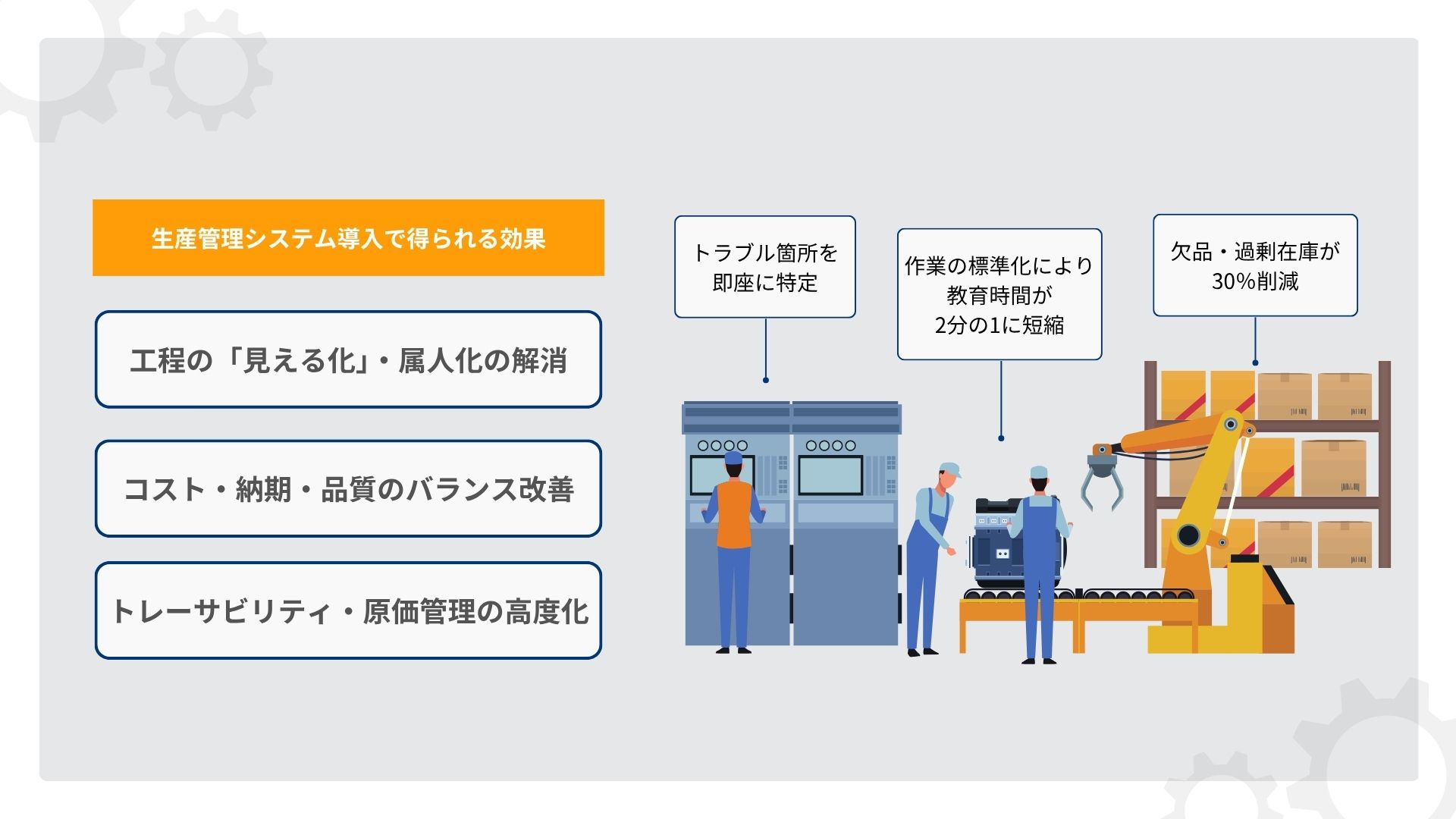 また、仕掛品や在庫の適正管理によって、余剰在庫・欠品を防止してコストを削減できたり、過去の生産実績をもとに現実的な納期計画を作成したりなどが可能です。