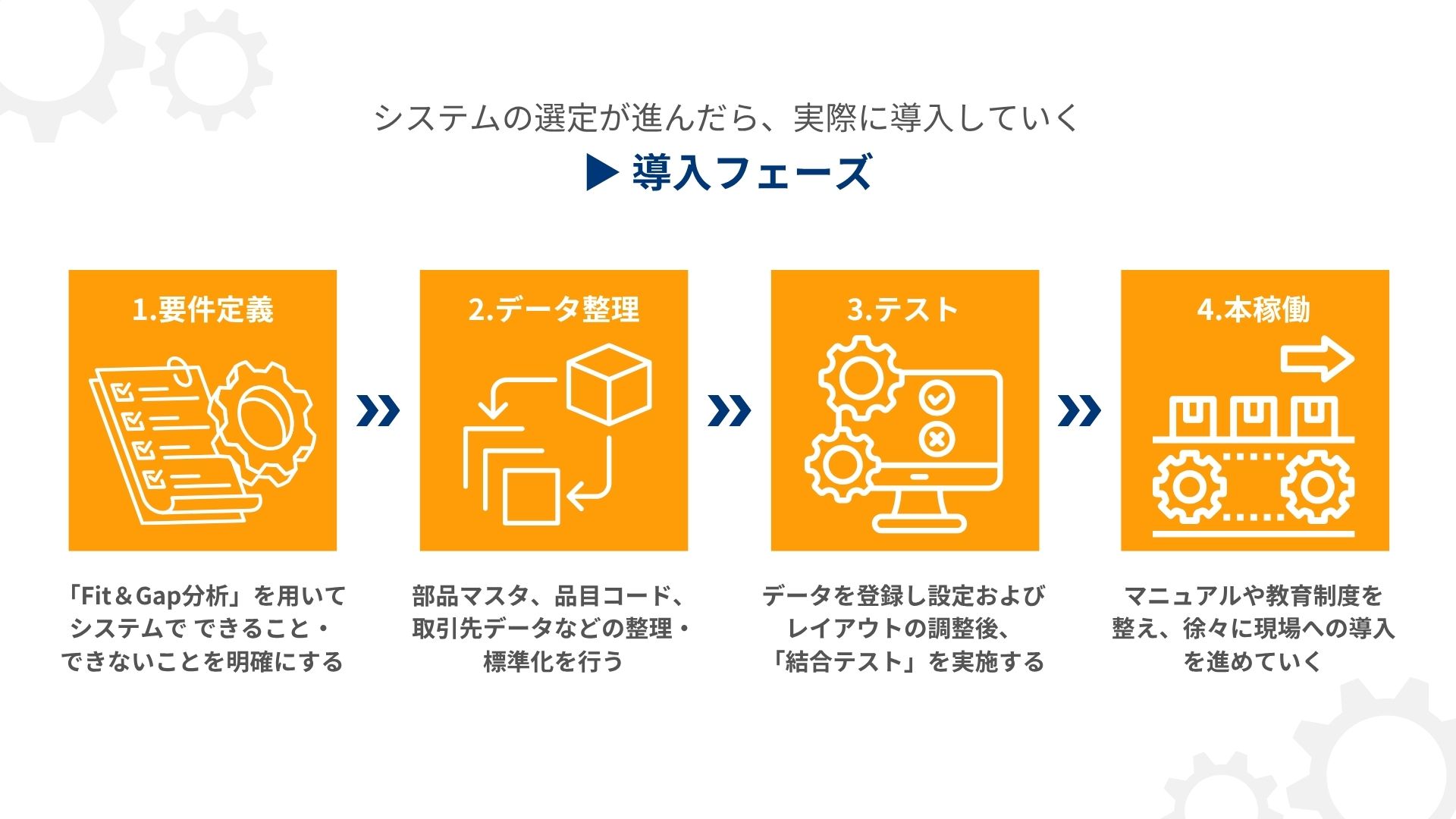 検討フェーズで製品の選定と社内検討が行えたら、実際にシステムを現場に導入していきましょう。