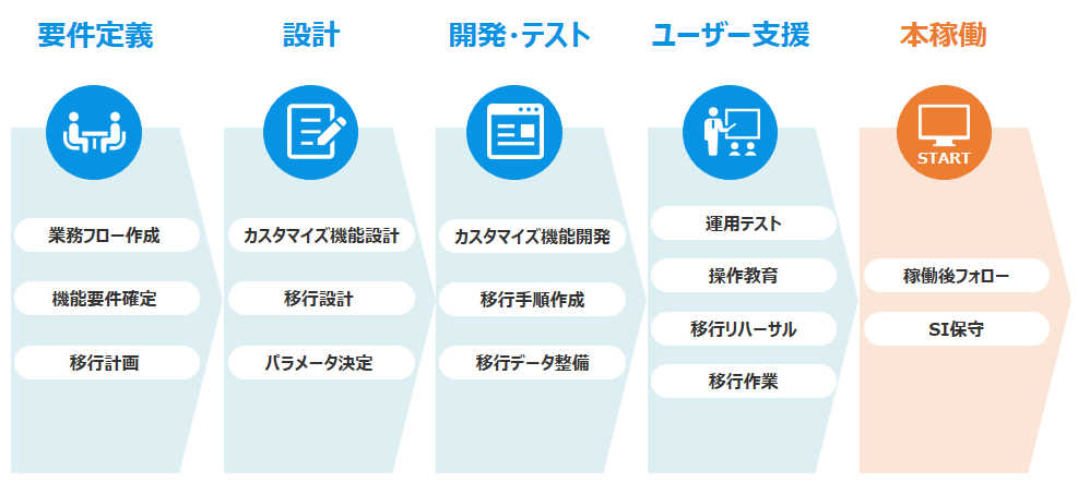 また、これまでの導入実績を基に作られた医薬品販売管理の標準業務フローを用いることで、要件定義や設計工程をスムーズに行い、短期導入を実現できます。